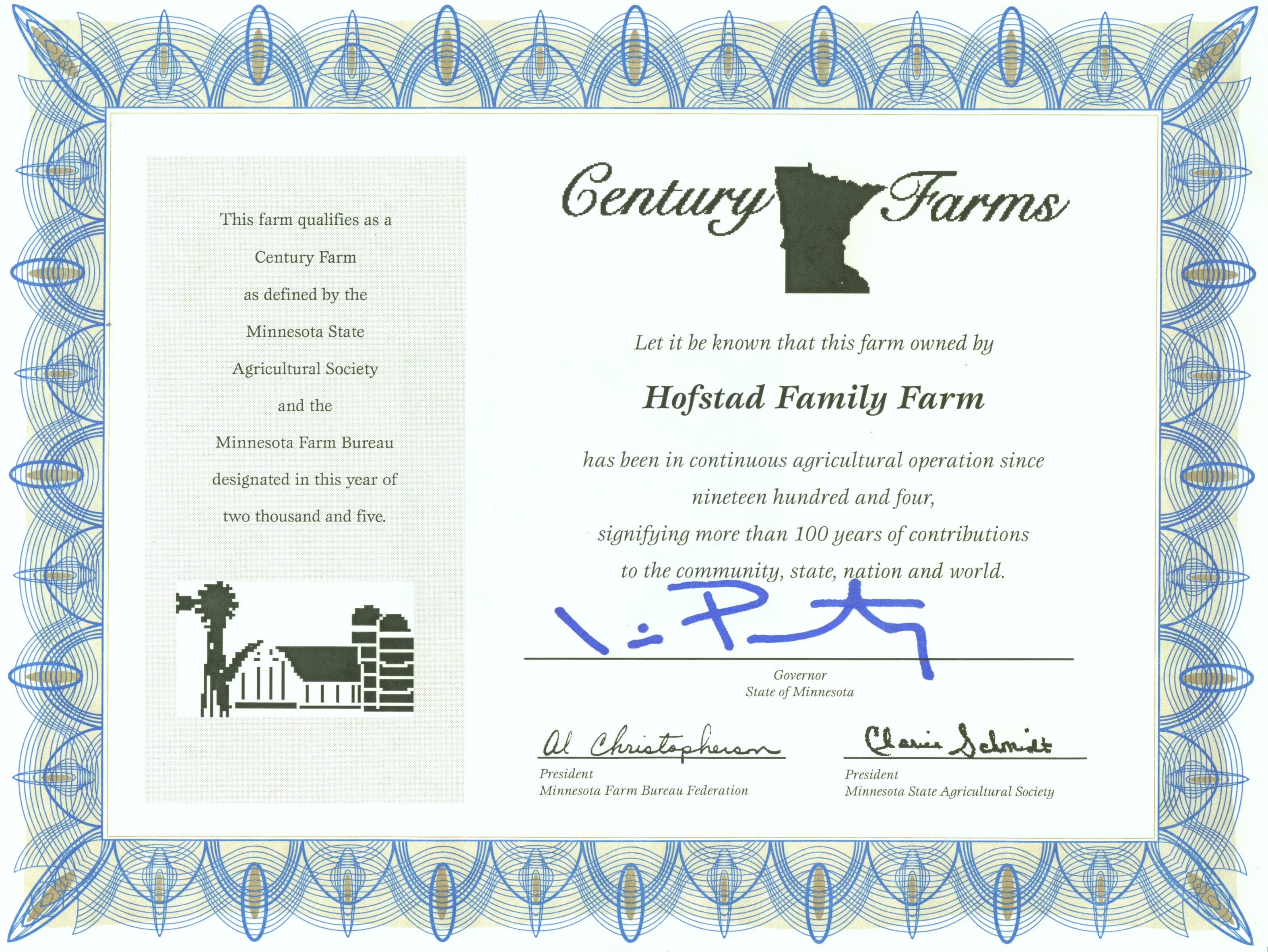 Our farm was awarded a 100 year recognition award by the Minnesota State Fair in 2005.